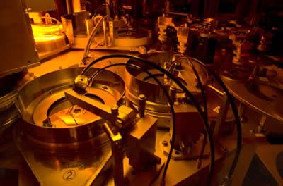 This is where things start to get shiny, this machine performs a process called Sputtering, which is NOT a strange sexual practice involving phlegm but is actually where a layer of silver which is 90 angstroms thick is added to the disc. Science buffs out there will know that an angstrom is a measurement equal to one millionth of a centimetre, science buffs that don't are endangering us all.